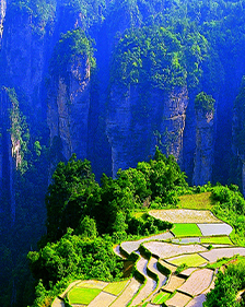 張家界,是湖南一個著名的風景區(qū),一座天然的森林公園。黃石寨、天子山、金鞭溪等勝境,是令游人心馳神往之地。在我們出發(fā)之初,心就早已高高飛揚,五個多小時的顛簸終于把我們載到了目的地,導游是一個年輕的女孩子,一見面就放開歌喉唱了首當?shù)赝良易宓母柚{,歌聲婉轉動聽,一下子讓我們領略到了鄉(xiāng)村